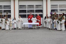 Christoph vor der Neuhofner Feuerwehrzentrale die Segnung vorbereiteter Palmzweige