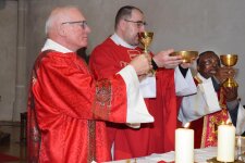 an, wo Pfarrer Christoph in Konzelebration mit P. Raimond und Assistenz von