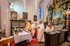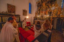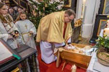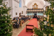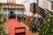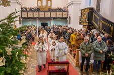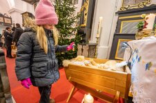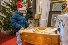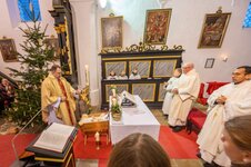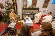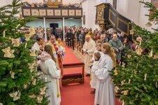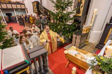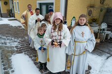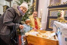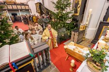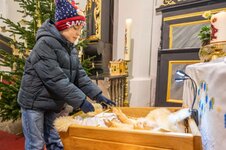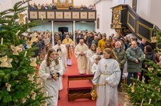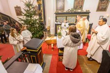 „Heute sollt ihr es erfahren: Der Herr kommt, um uns zu erlösen, und morgen werdet ihr seine Herrlichkeit schauen.“ So, der Eröffnungsvers zum Vorweihnachtsgottesdienst am Heiligen Abend. Während das Neuhofner Blechbläser-Sextett mit weihnachtlichen Melodien auf die nachmittägige Mette einstimmte, füllte sich der gar nicht so kleine Innenraum der St Veit Kirche mit örtlichen Messbesuchern und in der Mehrzahl sogar mit auswärtigen Gästen. Pfarrer Christoph leitete den Gottesdienst bei Konzelebration mit Kaplan Philipp unter Assistenz von Diakon Johann. 7 Messdiener aus der großen Neuhofner Ministrantenschar versahen dabei den Dienst am Altar. Der Chor Zeitlos unter Leitung von Barbara Farfeleder teilte sich die musikalische Messgestaltung mit einem Instrumentalquintett ambitionierter jüngerer Musiker und dem Chorgesang der Gläubigen, der mit Stefan Küllingers Orgelspiel eine harmonische Klangfülle erreichte. Mit Freude traten kleinere Kinder zur Krippe vor, um mit ihren Strohhalmen dem Christkind eine angenehme Nachtruhe zu verschaffen. Bei geradezu weihnachtlichem Schneegestöber endete unter Klängen des Bläsersextetts ein stimmungsvoller Gottesdienst in der Filialkirche St. Veit.